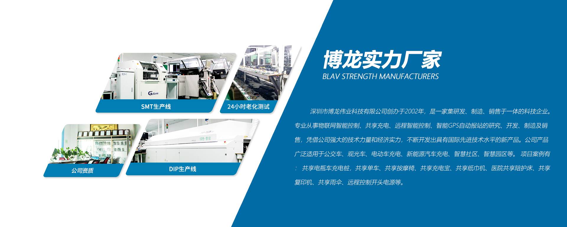 成立時間:深圳市博龍偉業(yè)科技有限公司創(chuàng)辦于2002年,是一家集研發(fā)、制造、銷售于一體的科技型企業(yè)。自主研發(fā)車載GPS報站器、車載視頻設備及安防視頻監(jiān)控、充電樁、智能遠程控制等產(chǎn)品;產(chǎn)品廣泛應用于共享單車,共享按摩椅,共享充電寶,共享紙巾機,醫(yī)院共享陪護床,共享復印機,共享雨傘,共享電動車充電樁,充電柜,換電柜,遠程控制開關電源,電池保護板等。 公司嚴執(zhí)行該質(zhì)量體系,對生產(chǎn)品質(zhì)進行全方位控制,公司擁有雄厚的技術力量、先進的生產(chǎn)、檢測設備、十余年的團隊管理與生產(chǎn)經(jīng)驗。曾先后榮獲多項專利和軟件著作權等。 我們的設計理念:安全低耗,高性能,低成本。博龍偉業(yè)以"專心、專業(yè)、專注"的